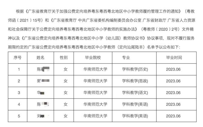 近日,广东陆丰市教育局发布《广东省公费定向培养粤东粤西粤北地区中小学教师(定向汕尾陆丰)违约人员名单》。