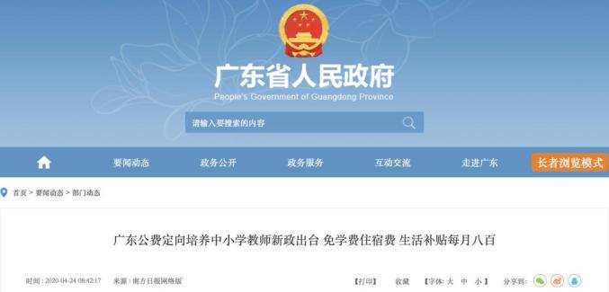 据了解,2020年,广东省教育厅等4部门联合印发了《关于公费定向培养粤东粤西粤北地区中小学教师的实施办法》。