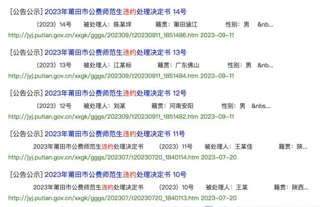 今年以来,福建莆田市教育局曾发布多则公费师范生违约处理决定书。